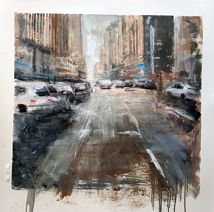 La scelta dei soggetti nasce dall’inconscio che, influenzato dalla realtà, crea percorsi mentali che terminano sulla tela. Così le città nascono dall’interpretazione del mondo che cambia velocemente e, nelle vedute urbane, la pittura istintiva, gestuale e dinamica di Pini si esprime al meglio. Gli elementi raffigurati sono resi riconoscibili nonostante l’assenza di dettagli, superflui per l’artista, le prospettive e le ombre riscritte, il punto focale assente, l’equilibrio delle linee rotto. E così, un ambiente urbano che non dovrebbe lasciare dubbi, crea smarrimento in chi guarda. Nonostante raramente l’artista raffiguri forme umane, la presenza dell’uomo è avvertita e queste visioni di città trasmettono sensazioni di vita vorticosa e di frenetico affollamento.