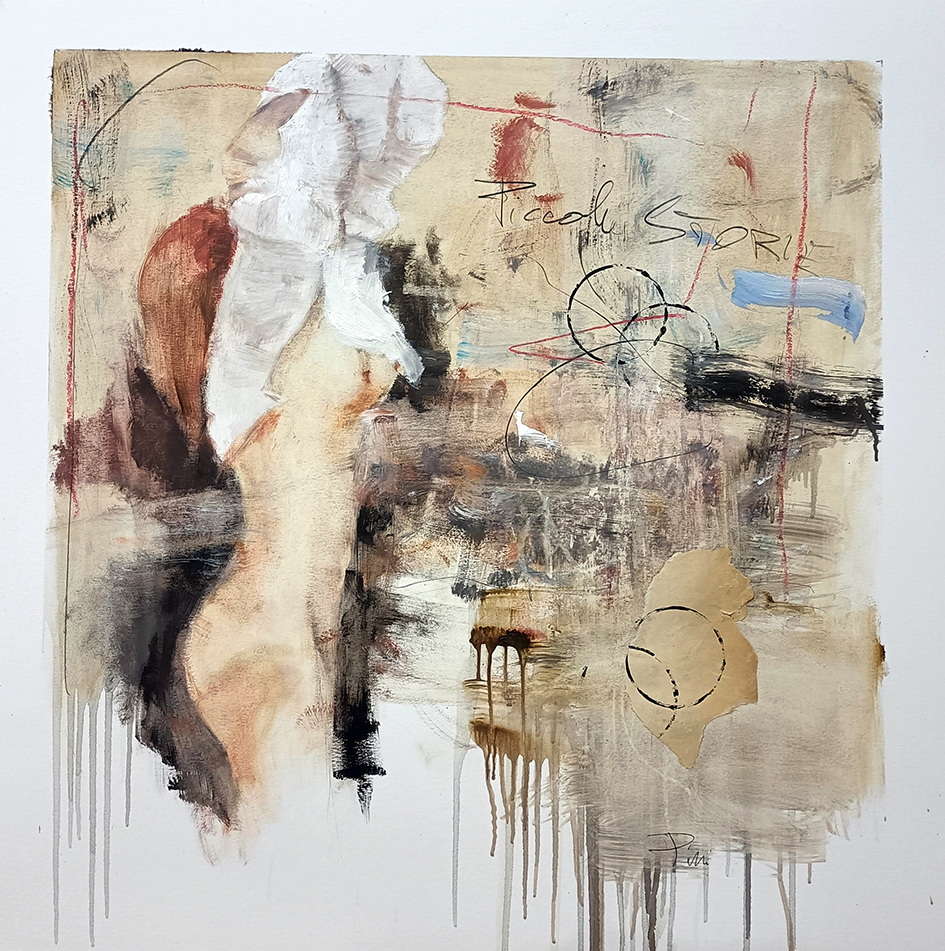 Fanciulle e animali prendono vita su tavola mediante il disegno a grafite e collage con fondo di legno al vivo o con foglia simil oro e acrilico, invitando a oltrepassare la soglia che conduce a un mondo parallelo dove torna al centro la cura del creato attraverso la profonda connessione del femminile con la natura.