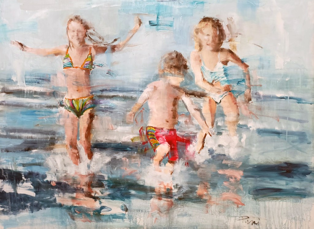 Nelle opere del ciclo Adriatico, esposte qui per la prima volta, la poetica di Alfredo Pini muta. Il mare sembra essere per l’artista antitetico alla città. L’acqua, elemento primordiale, nell’arte ha spesso significato rinascita e purificazione e per Pini è il luogo in cui la figura umana si inserisce spontaneamente, con naturalezza. Per comunicare armonia, una licenza poetica: usare le pennellate per unire gli elementi. I corpi si fondono con il mare e il mare con i corpi, il cielo confluisce nel mare e il mare nel cielo. Tutto è connesso, armonico, solo un’onda può trasmetterci un minimo di disagio.